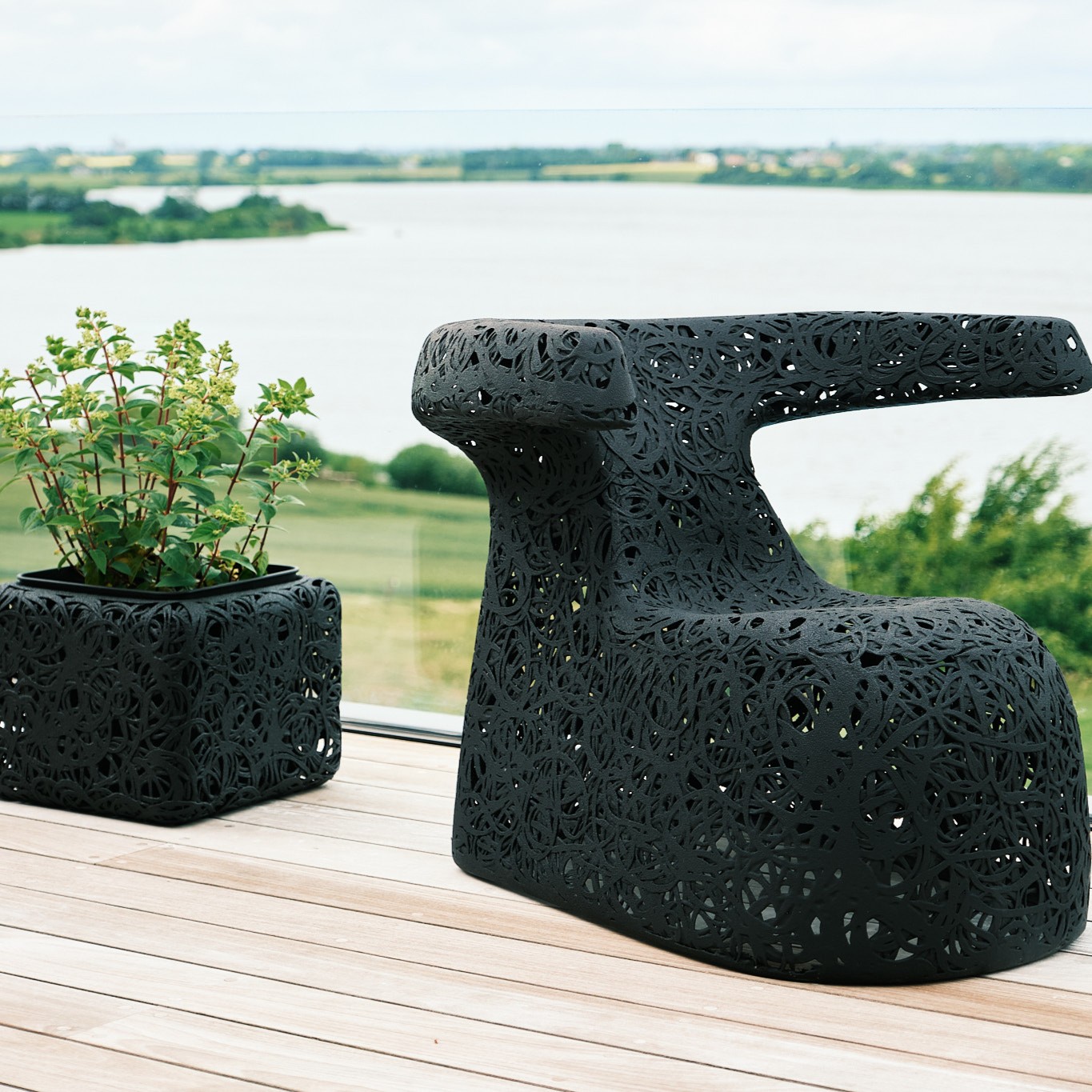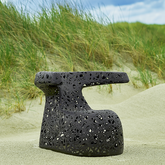 La chaise Hug est une chaise ergonomique pour se détendre dans le jardin et ressemble un peu à une limace noire. La chaise possède un dossier et des accoudoirs distinctifs qui en font une chaise longue moderne et extrêmement confortable qui vous invite à vous attarder.