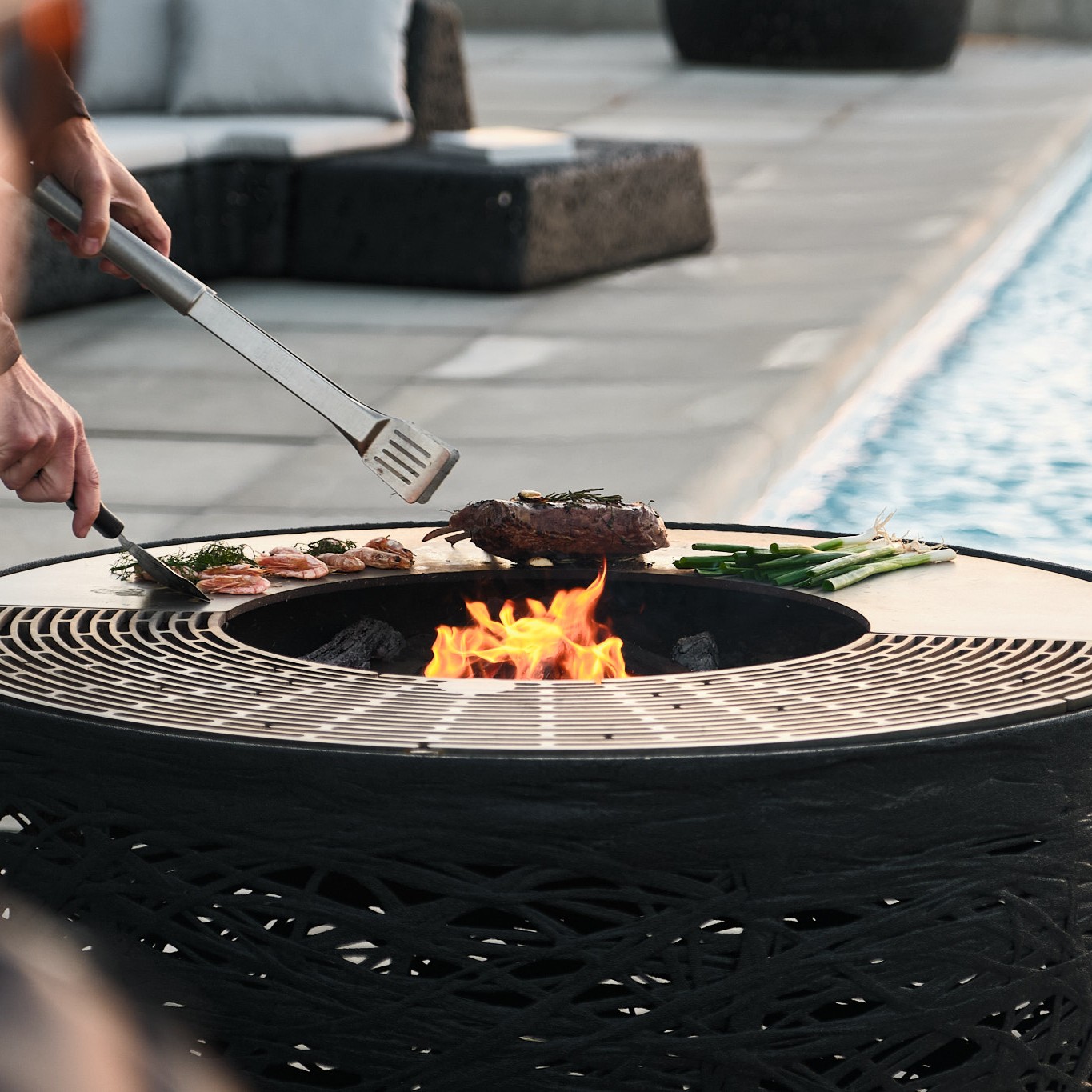 Bien plus qu’un simple élément décoratif, le Lava Nest Firepit est conçu pour offrir des performances optimales. Sa surface de cuisson en acier inoxydable garantit des conditions idéales pour la cuisine en plein air, tandis que la pierre de lave améliore à la fois la sécurité et l’expérience.